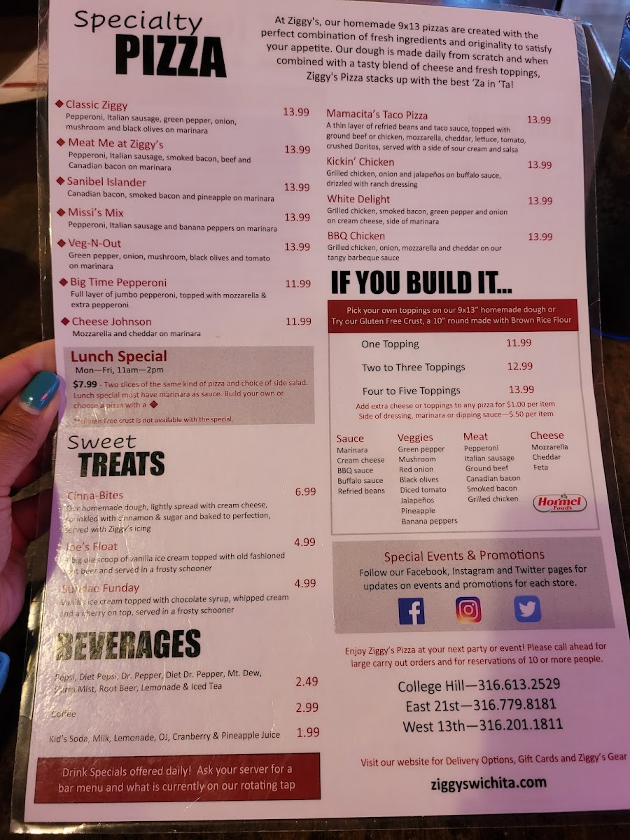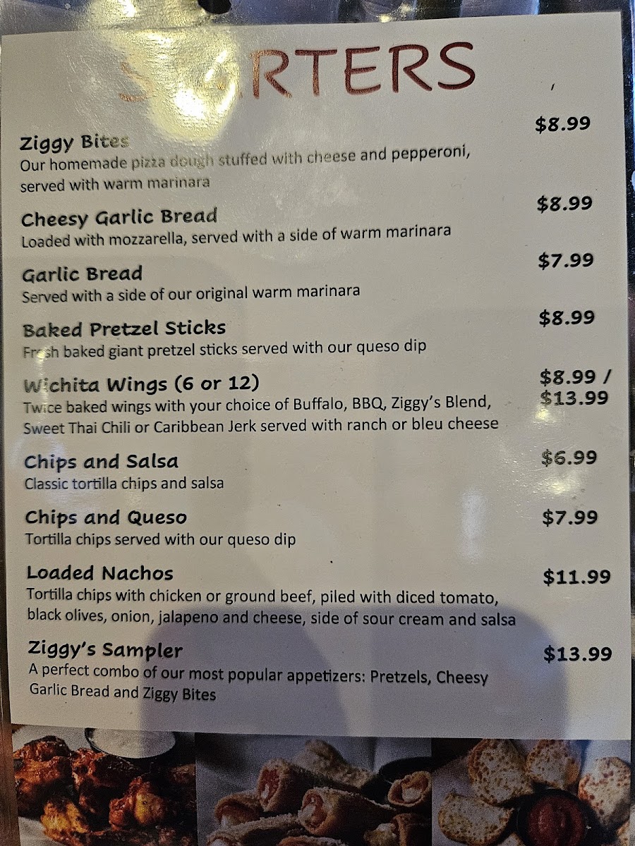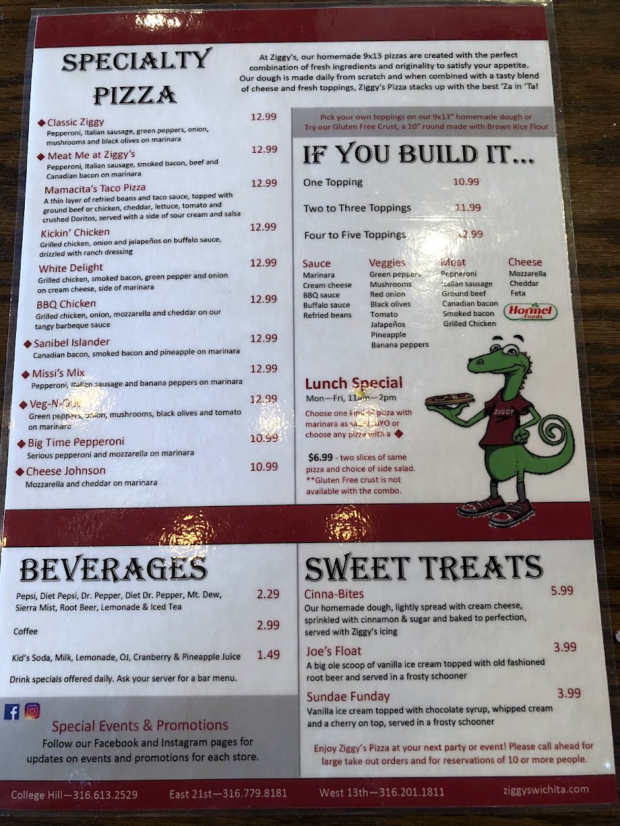 Introducing the menu at Ziggy's Pizza East, located in Wichita, Kansas, is a delightful experience for both pizza lovers and casual diners alike. This inviting eatery offers a diverse selection that goes beyond traditional pizzas. You can savor tantalizing signature pizzas like the Kickin' Chicken and Taco Pizza, which have already garnered rave reviews from customers.